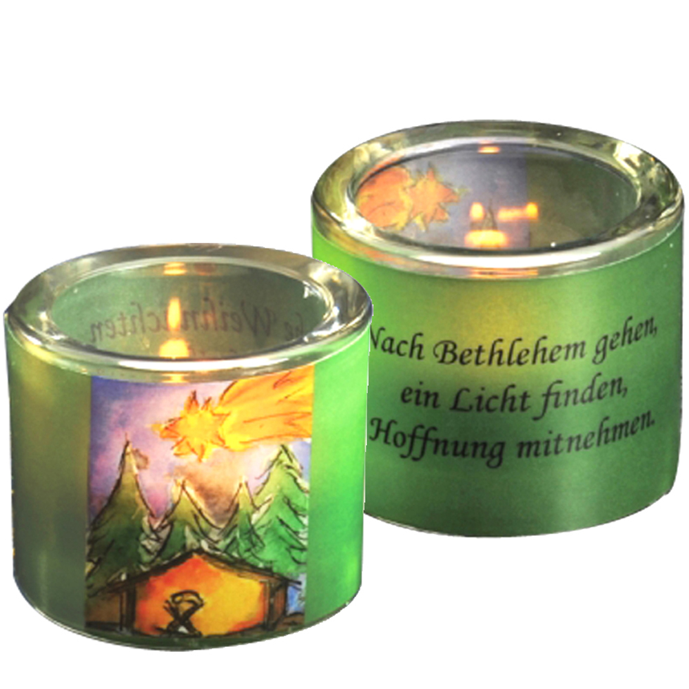 Glaslicht KRIPPE mit Spruch, grün -Rest-
